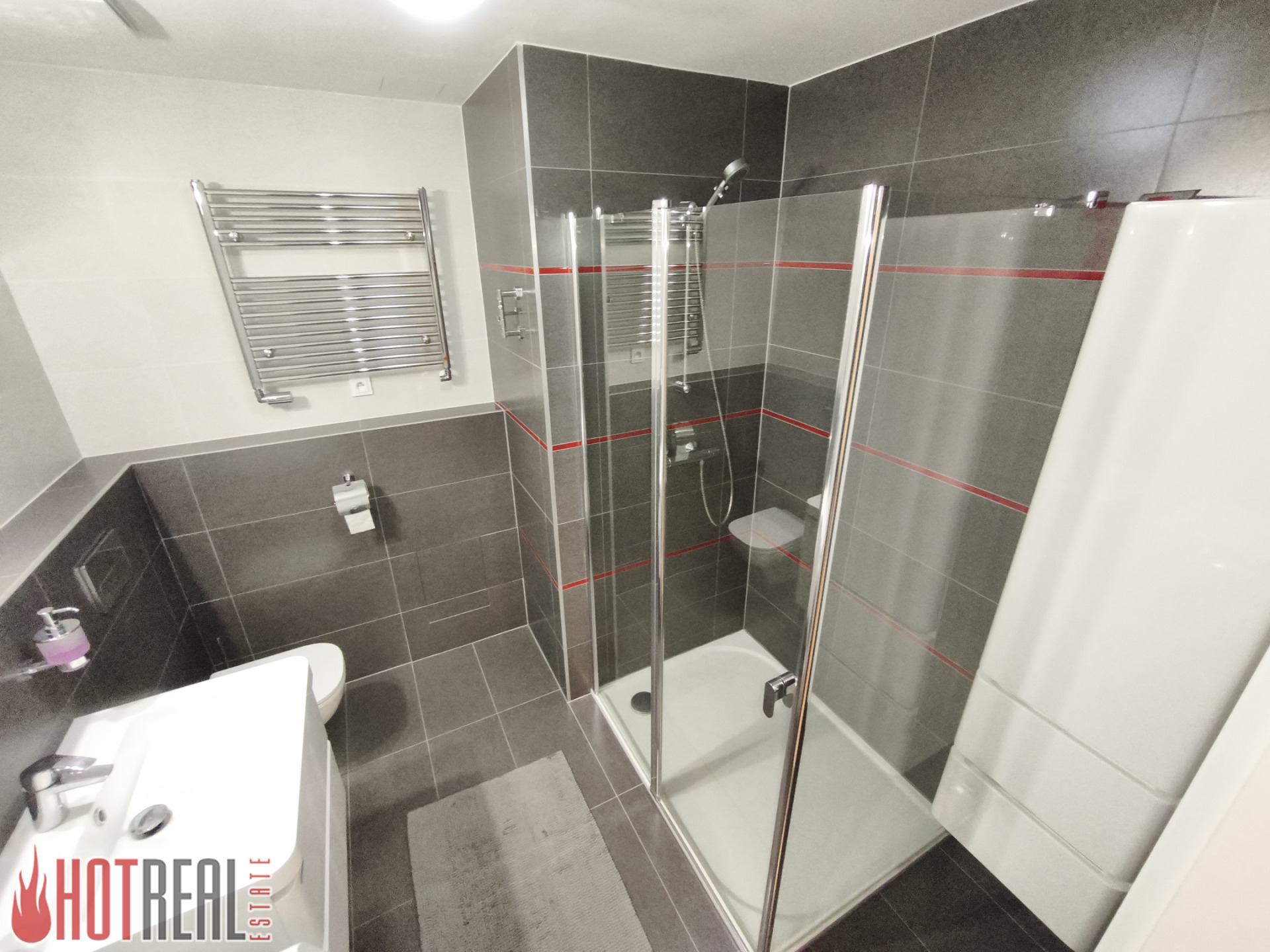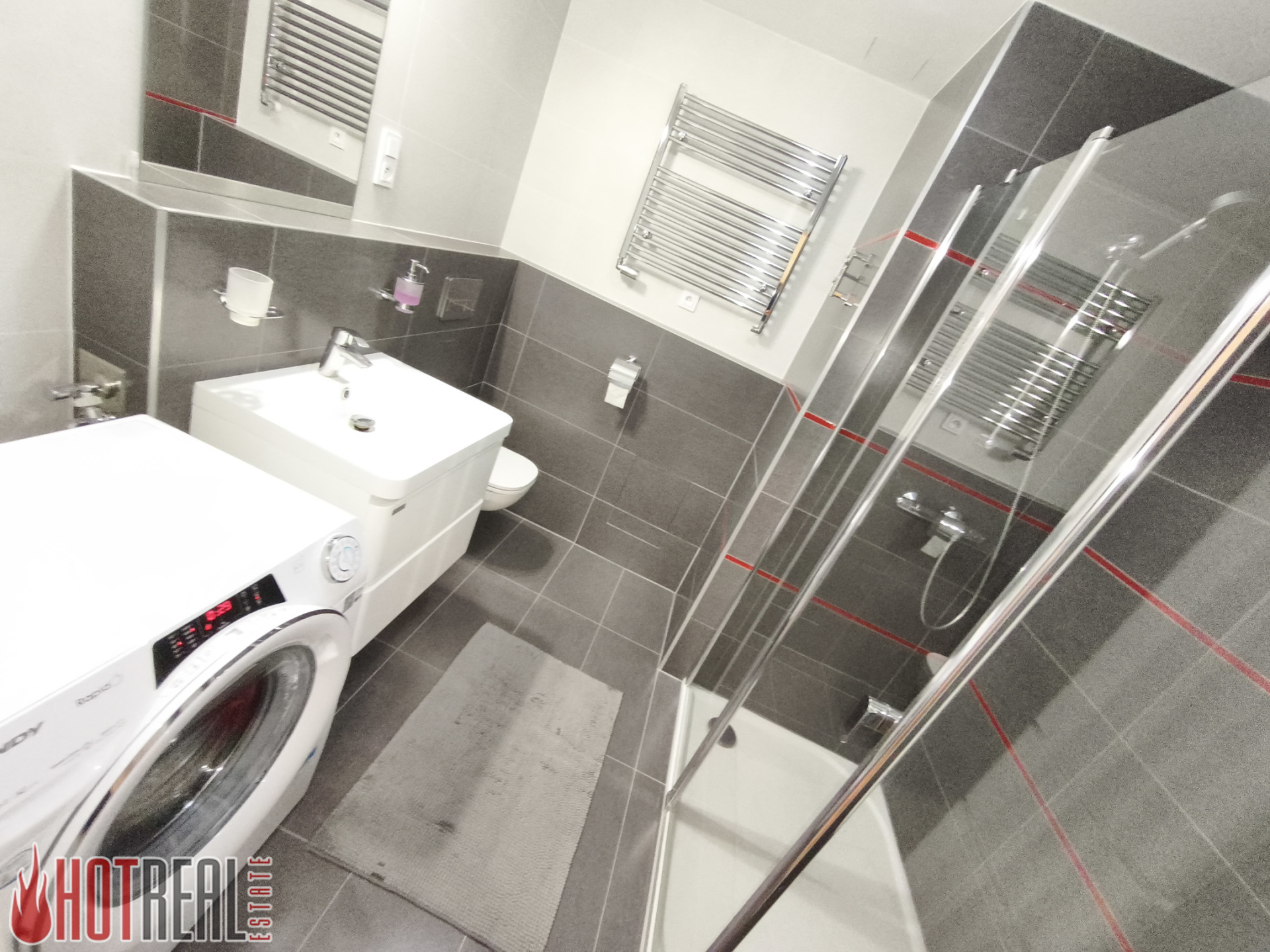 Koupelna s prostorným sprchovým koutem zn. Ravak, prostorem na pračku, umyvadlem, toaletou a topným žebříkem.